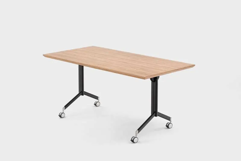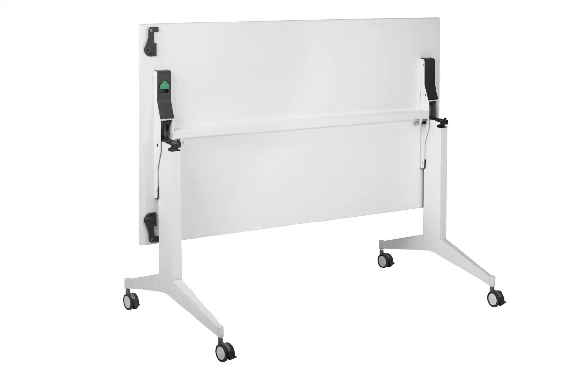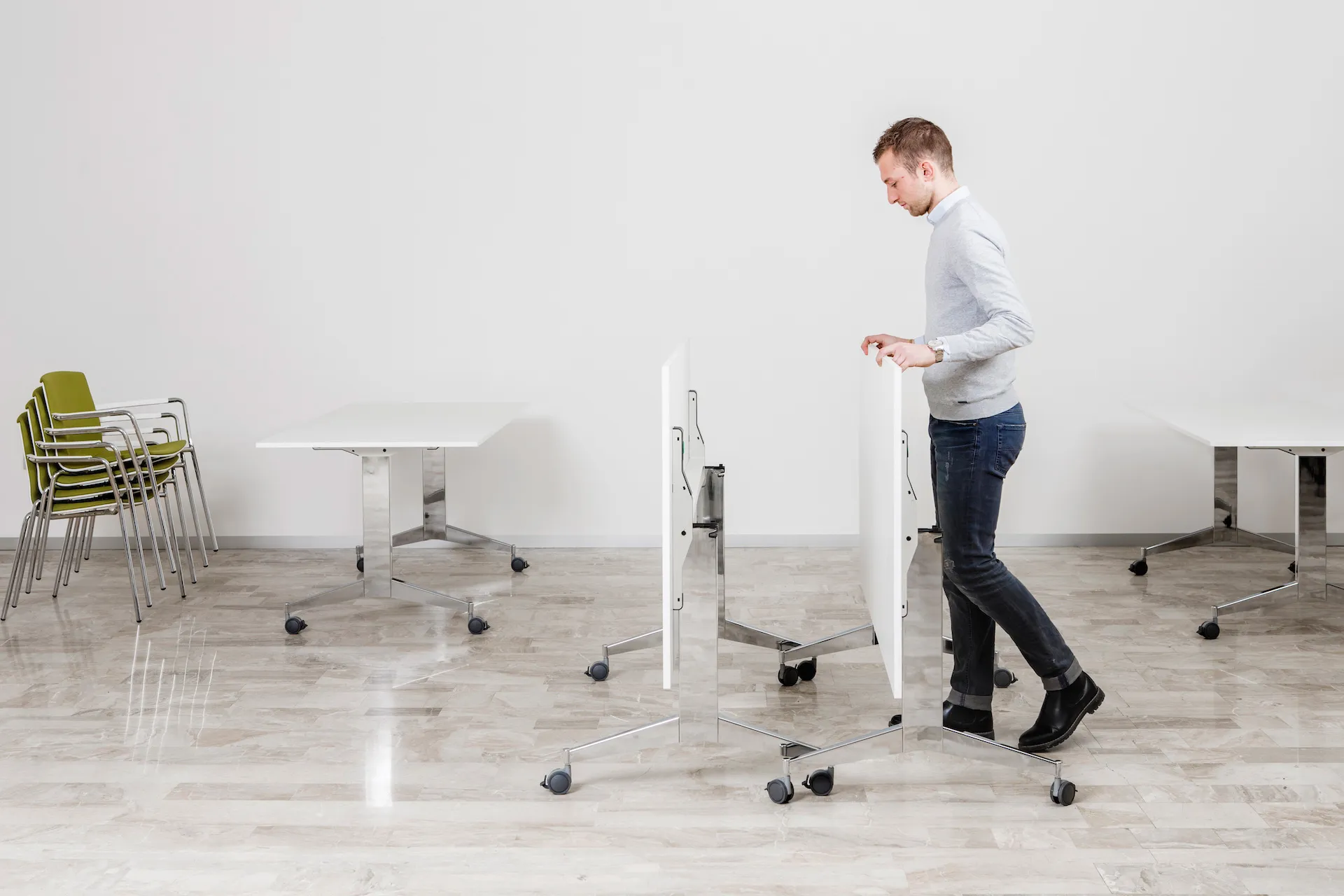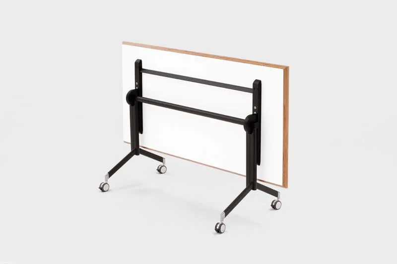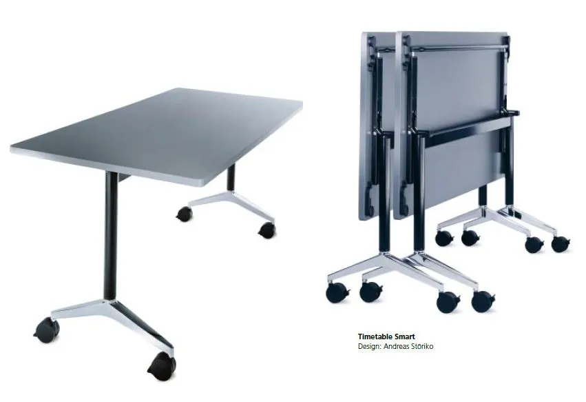 Hochwertige Konferenzräume um eine neue Dimension erweitert: Die Platte lässt sich mit nur einem Griff nach oben schwenken, wobei sich gleichzeitig die Fußausleger mit den feststellbaren Rollen vollautomatisch eindrehen. So ist der Tisch nicht nur mühelos von Raum zu Raum zu bewegen, sondern auch äußerst kompakt ineinander zu staffeln.